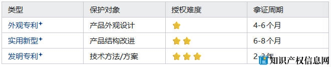 我们在申请专利之前一定要知道自己要申请什么样的专利,专利一共分为3种类型,有外观专利、实用新型专利、发明专利。每一种类型的保护对象、申请难度和审核周期都不一样,具体可以看下方为大家制作的一个表格来进行对比。